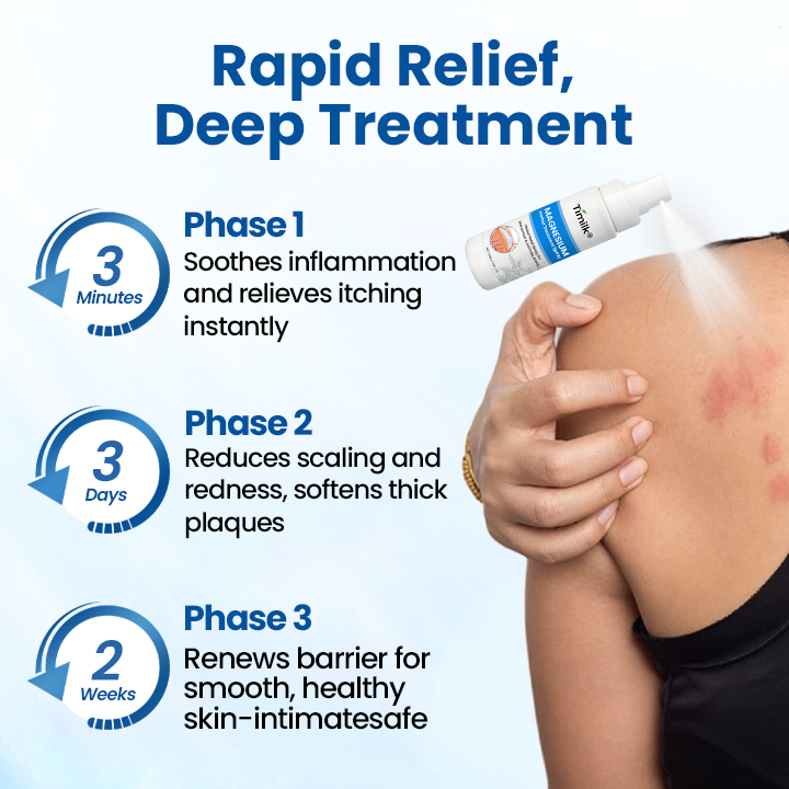 Timilk® Magnesium Repair Spray penetrates deep into the skin, gently cleansing from the inside out and quickly relieving itchiness and inflammation caused by psoriasis. This steroid-free, non-irritating formula is safe for sensitive and compromised skin, helping regulate excessive skin cell proliferation while soothing redness, flaking, and stinging to restore your skin's natural barrier.
